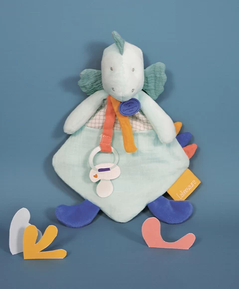 Le doudou attache sucette dinosaure vert Filou rassure et apaise Bébé, lorsqu’il a besoin de réconfort et de familiarité.