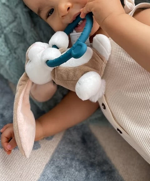 La collection HOULAHOP, ce sont d’adorables petits doudous animaux accessoirisés d’un anneau de dentition en silicone qui permettra à bébé de soulager ses maux de dents. Ces petits animaux tout doux sont prêts à se faire câliner! De petite taille, ils sont facilement manipulables par les mains de bébé. Leur petit nez et leurs yeux sont brodés. C’est un Doudou évolutif puisque son propriétaire pourra faire passer la petite tête d’animal au travers de son anneau et ainsi s’éveiller et s’amuser !