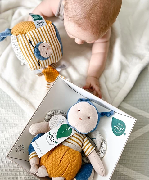 Les matières BIO utilisées pour ce Doudou ont été choisies méticuleusement pour éveiller les sens des enfants. Ce doudou a été travaillé avec soin pour être facile à manipuler et répondre à tous les besoins des bébés. Un cadeau engagé et responsable !