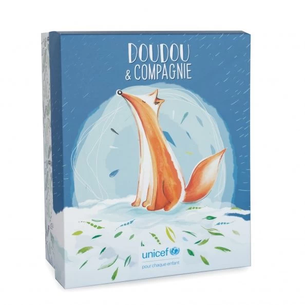Peluche Renard Doudou et compagnie en partenariat avec l’UNICEF, vendue dans une jolie boîte.