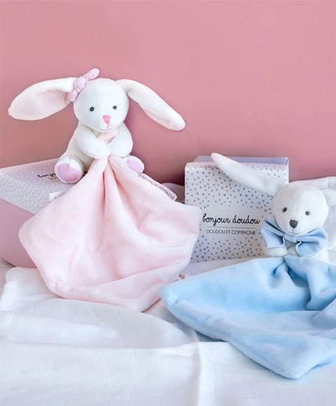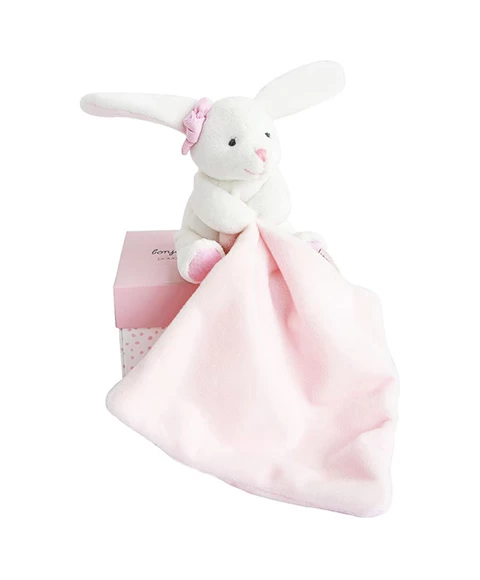 Le doudou mouchoir mini format Lapin rose est un cadeau de naissance idéal et original, tout doux pour que bébé commence à découvrir de nouvelles textures dès sa naissance, Ce mini-doudou lapin avec son petit nud à loreille est vraiment trop chou ! Une boite fleur est incluse,