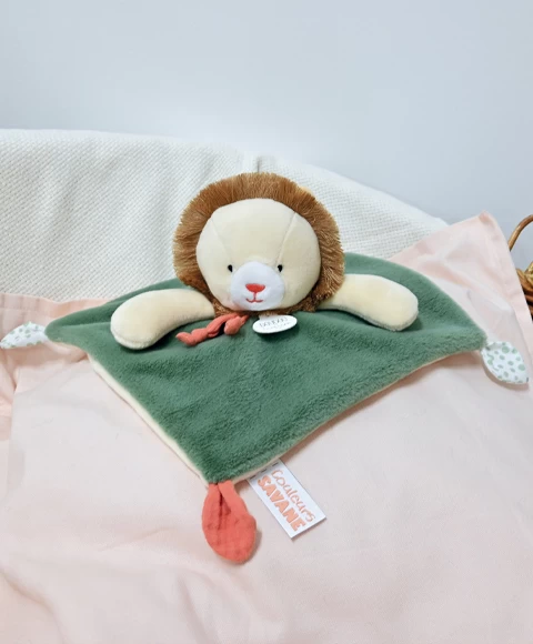 Avec ce doudou plat lion de la Collection « COULEURS SAVANE », Bébé saura facilement jouer, rêver et s’éveiller au monde qui l’entoure ! Doudou lion est idéal pour accomplir de grands rêves ! Ce Doudou plat est composé de deux tissus, l’un ultra doux en velours de coton et l’autre en coton imprimé pour un toucher différent à apprécier en fonction de son humeur. Orné de 2 nouettes en coton, et 2 nouettes en coton lange à manipuler par les petites mains de Bébé. Cette diversité de matières permettra à bébé d’apprécier des moments de calme, d’apaisement et d’endormissement.