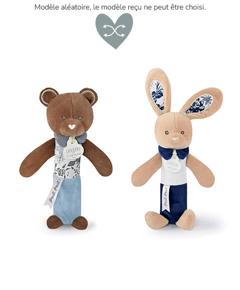 Le pouet pouet BOH’AIME, une adorable frimousse toute douce et un pouet pouet qui stimulera l’audition et le toucher des bébés. En grandissant, bébé pourra même l’attraper et l’actionner facilement. Les hochets Pouet Pouet BOH’AIME sont à offrir dès la naissance.