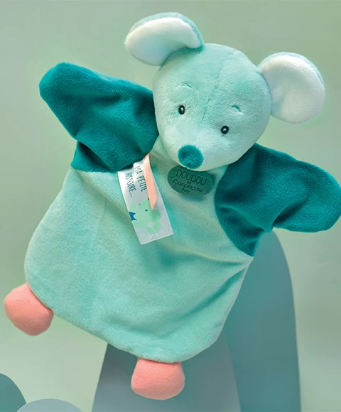 Très jolie marionnette Doudou Souris verte d’eau, très douce avec ses belles matières, rigolote avec sa petite étiquette personnalisée à l’effigie du personnage, Elle a été travaillé avec soin pour être facile à manipuler et répondre à tous les besoins des bébés, Idéale pour raconter des histoires tout en tendresse et complicité, en stimulant les sens et l’imagination dès la naissance,