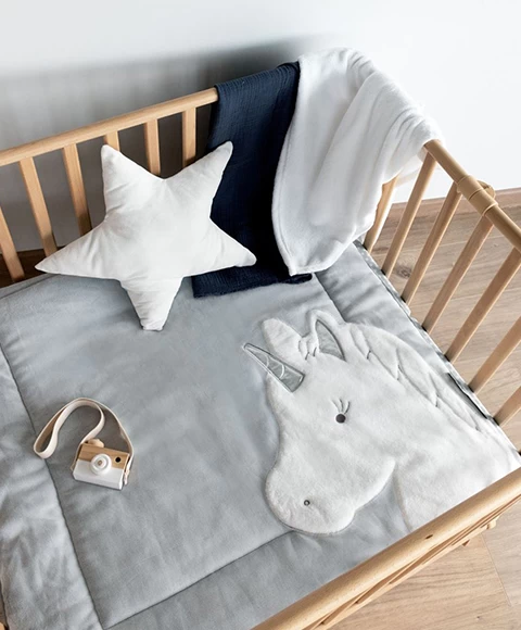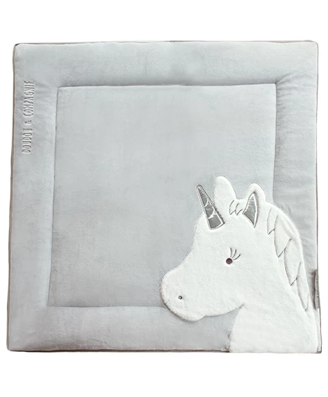 Découvrez ce tapis de chambre tout doux ! Un joli motif Licorne est appliqué sur le tapis et l’intérieur de ses petites oreilles et sa corne sont en paillettes. Très rigolo et très tendance ! Ce tapis de parc mesure 100×100 cm.
